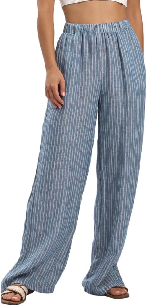 Women's 100% Linen Elastic Waist Stripes Wide Leg Pants