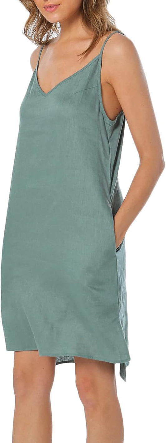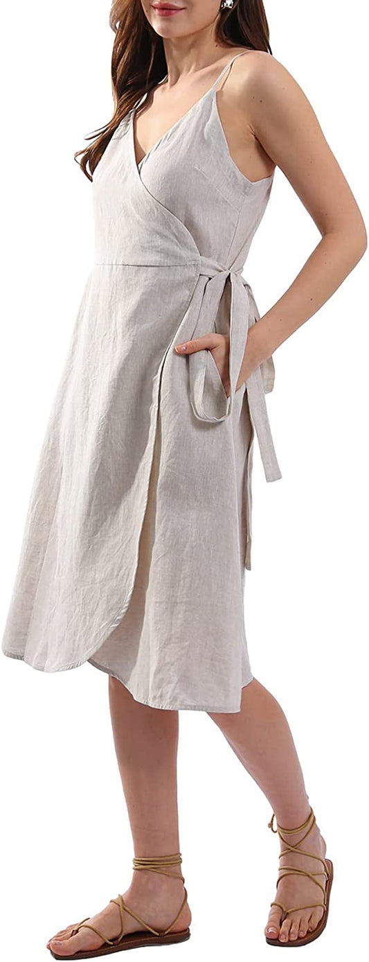 Women's 100% Linen V Neck Spaghetti Strap Dresses with Slit