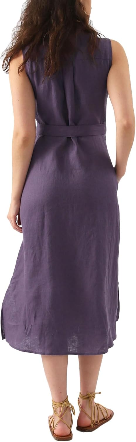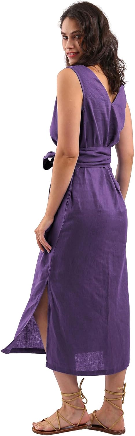 Women's 100% Linen Sleeveless Midi Dresses with Belt