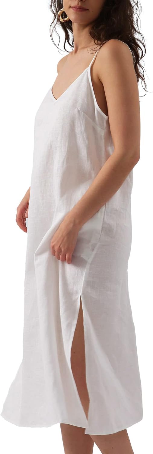 Amazhyu 100% Linen Spaghetti Strap Dresses with Slit