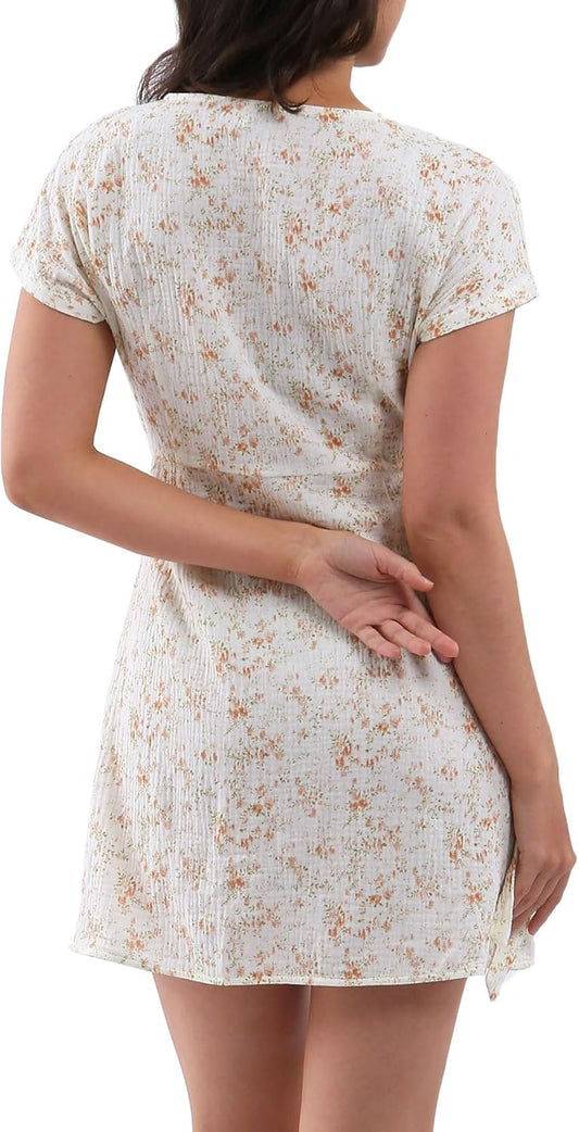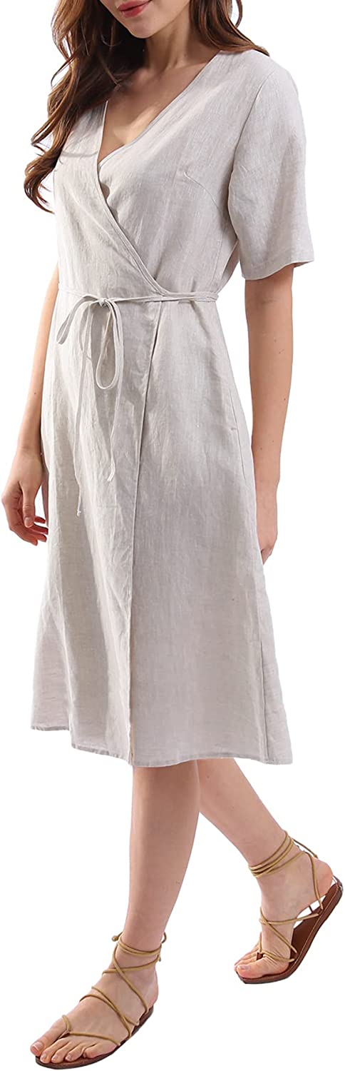 Womens Pure Linen Summer Short Sleeve Wrap Midi Dresses