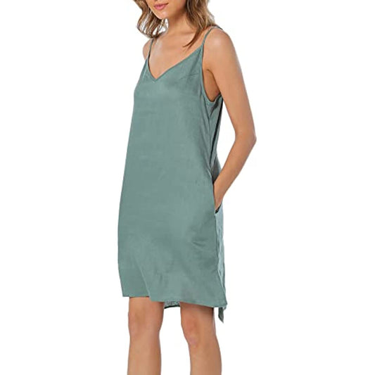 Women's 100% Linen Spaghetti Strap Slip Midi Dress with Pockets