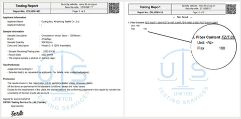 Pure linen fabric testing certificate