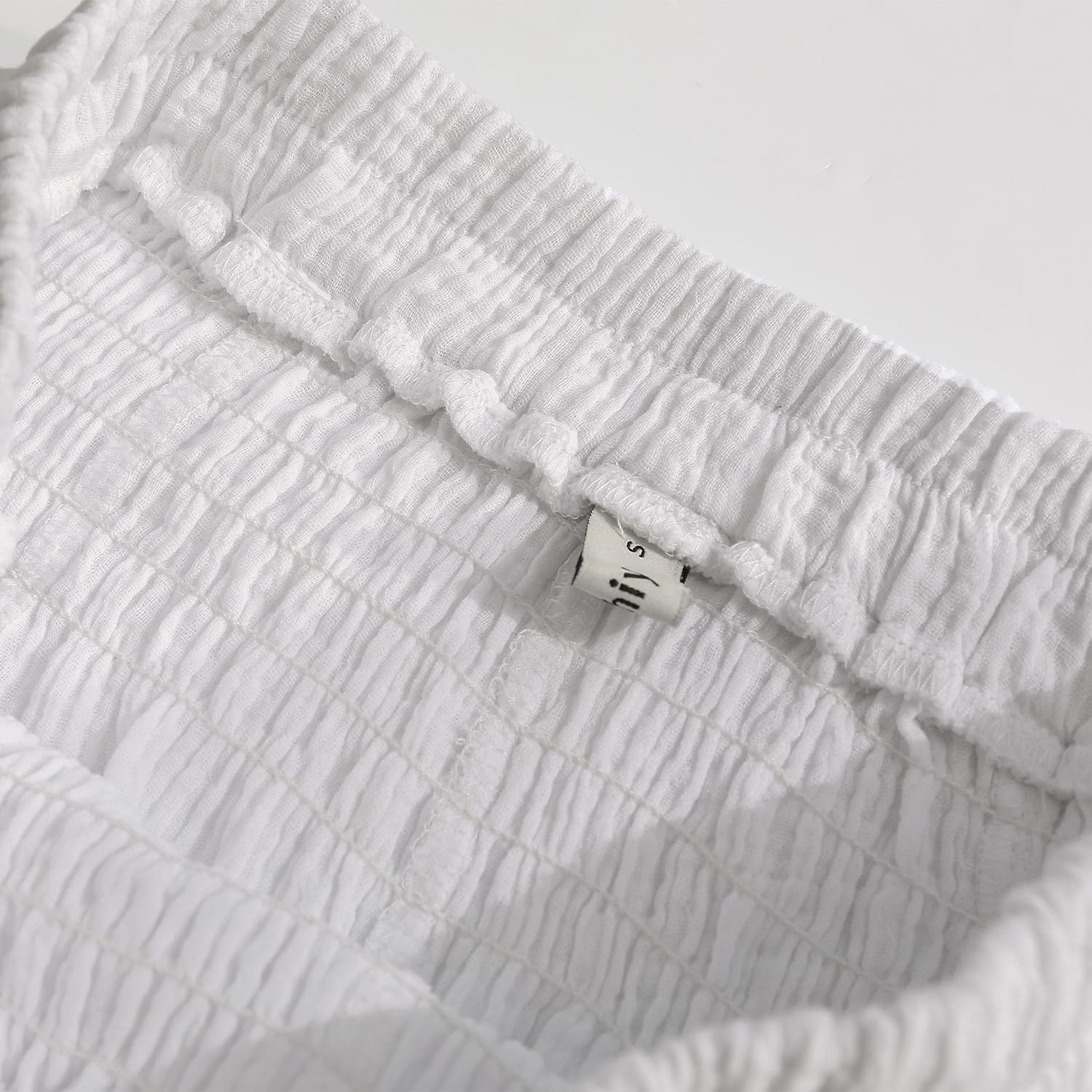 These summer pants feature a high-rise, smocked elastic waistband, wide legs, slant pockets, solid color, loose fit