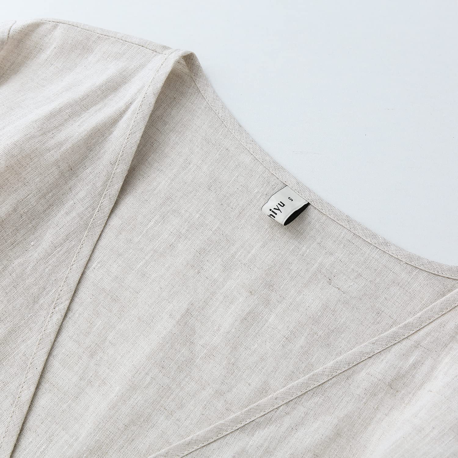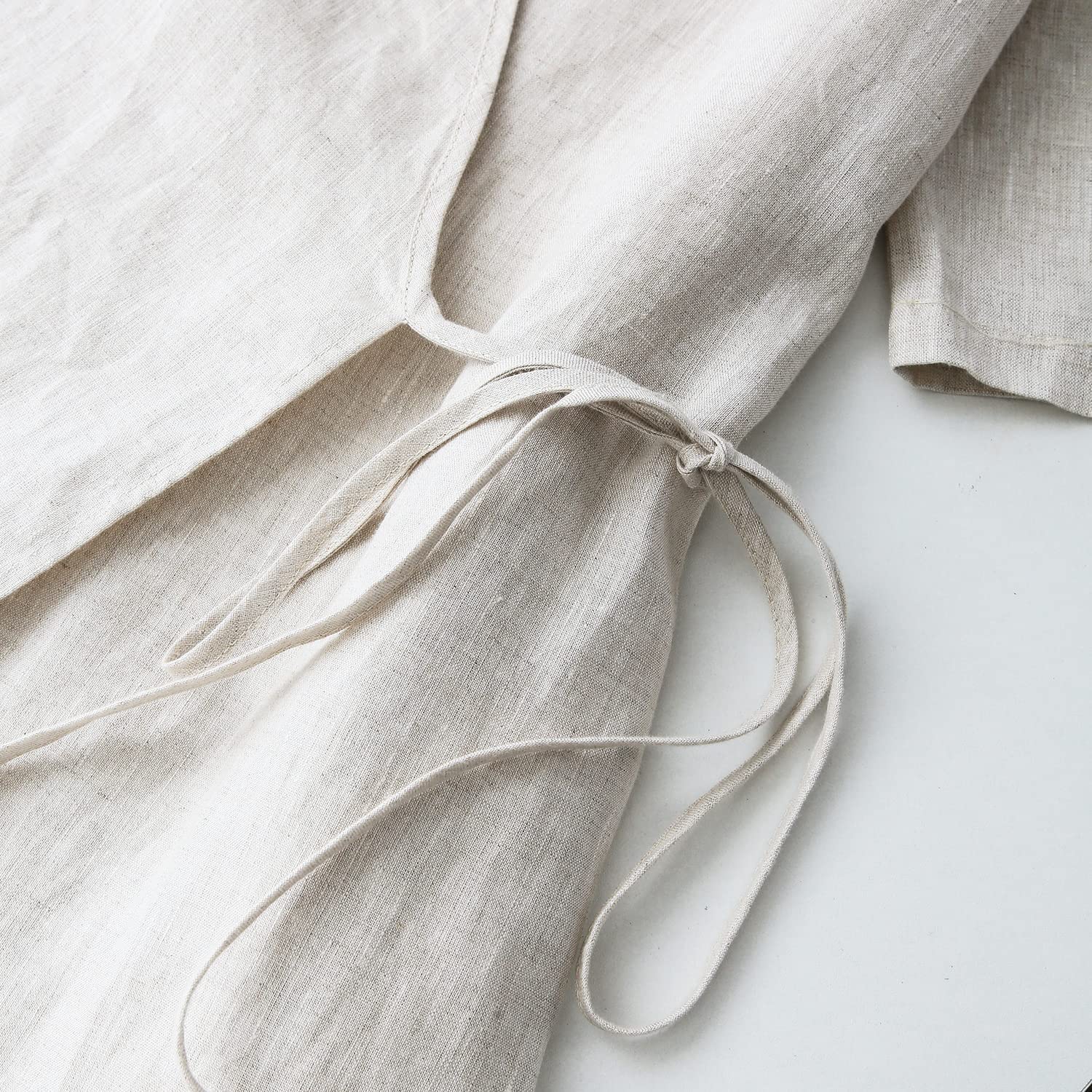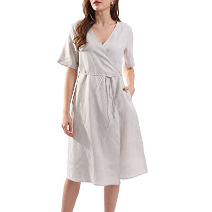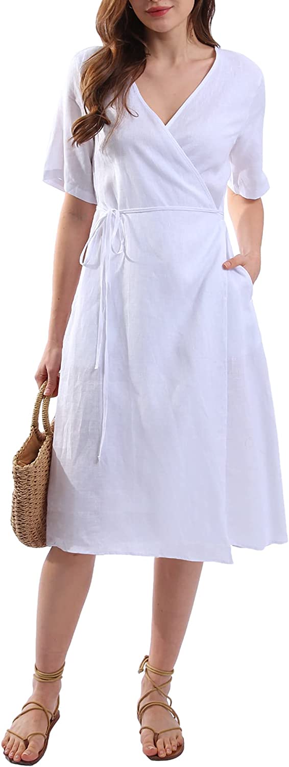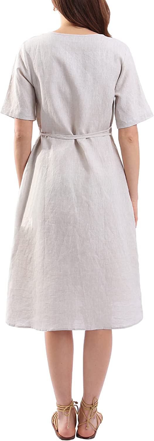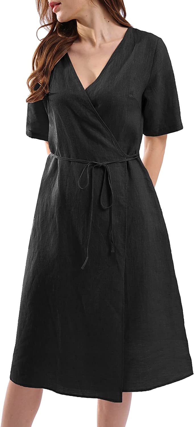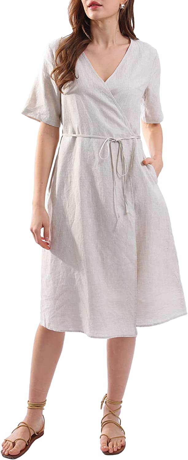 Womens Pure Linen Summer Short Sleeve Wrap Midi Dresses