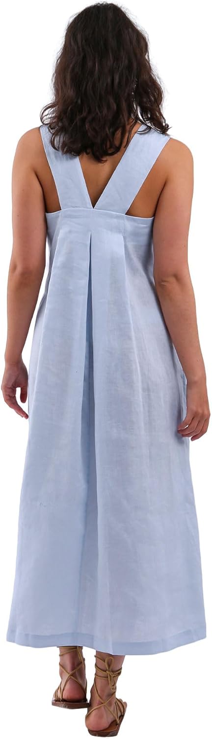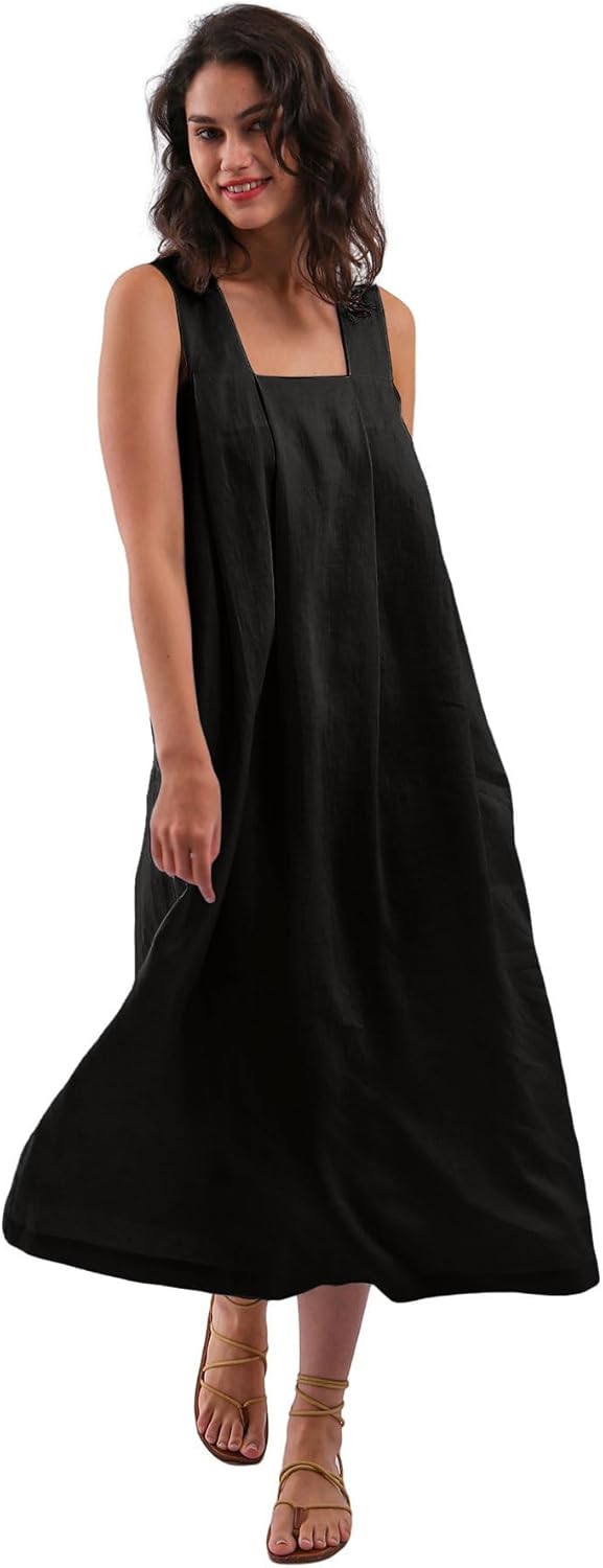 Women's 100% Linen Sleeveless Strap Midi Dresses with Pockets
