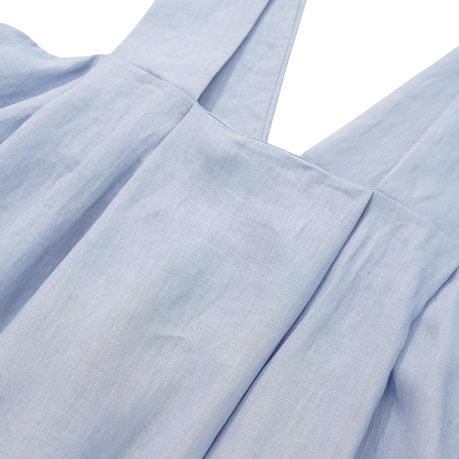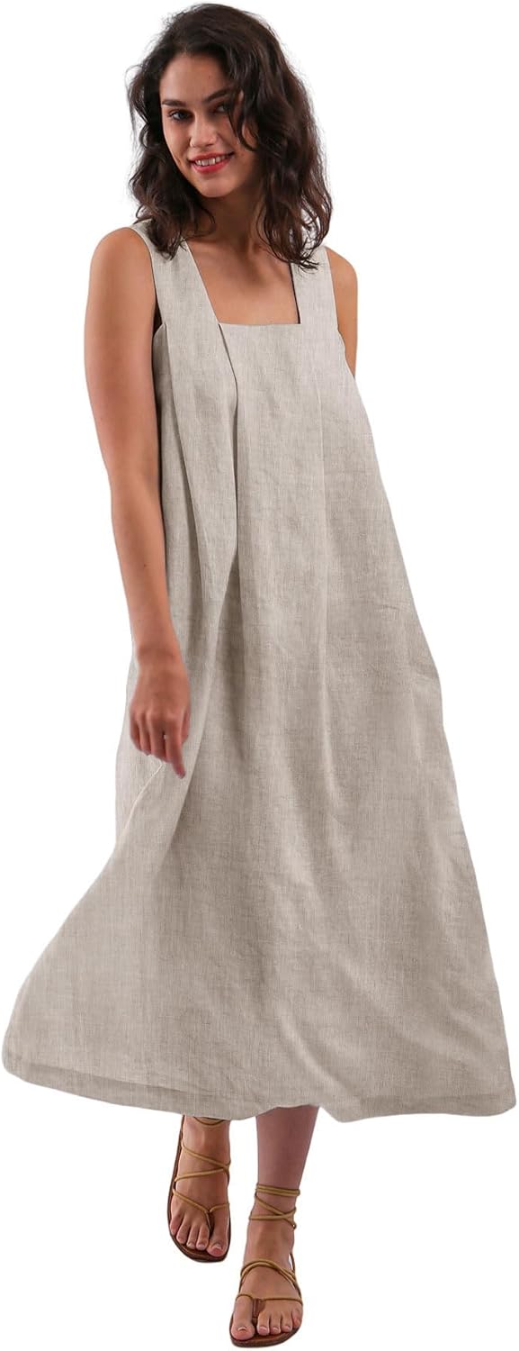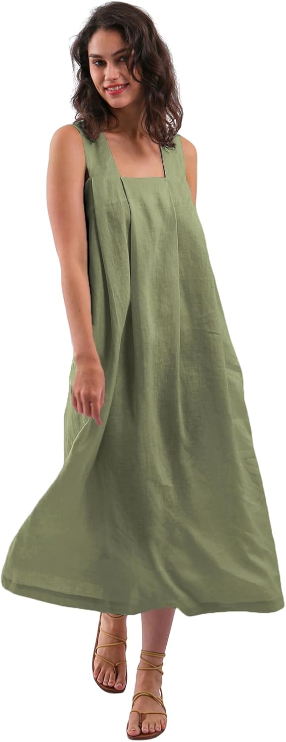 Body Material: 100% LinenFeature: A wide shoulder strap, sleeveless, square-cut neckline, slant pockets, pleated detail on front and back, solid color, midi length, relaxed fit